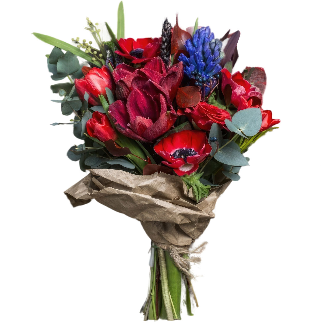 Амариллис, гиацинт синий, анемон красный , тюльпан красный, эвкалипт. Упаковка (лента, пленка, крафт, сетка, пленка матовая)