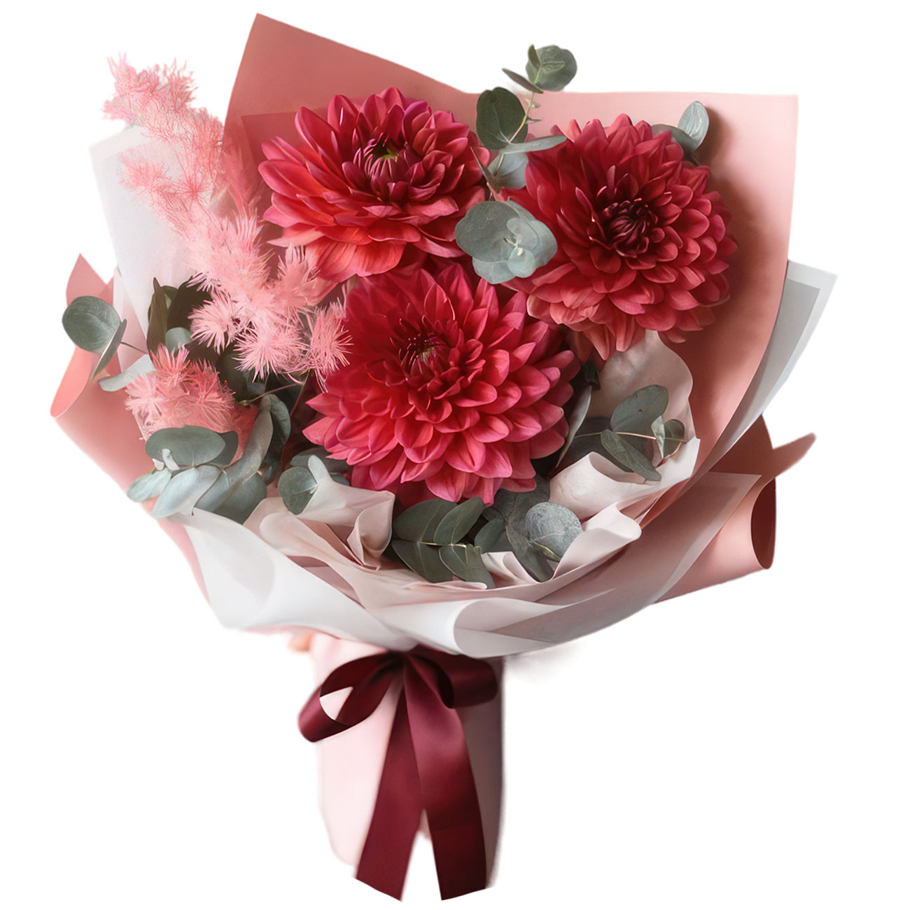 Георгина красная, эвкалипт. Упаковка (лента, пленка, крафт, сетка, пленка матовая)
