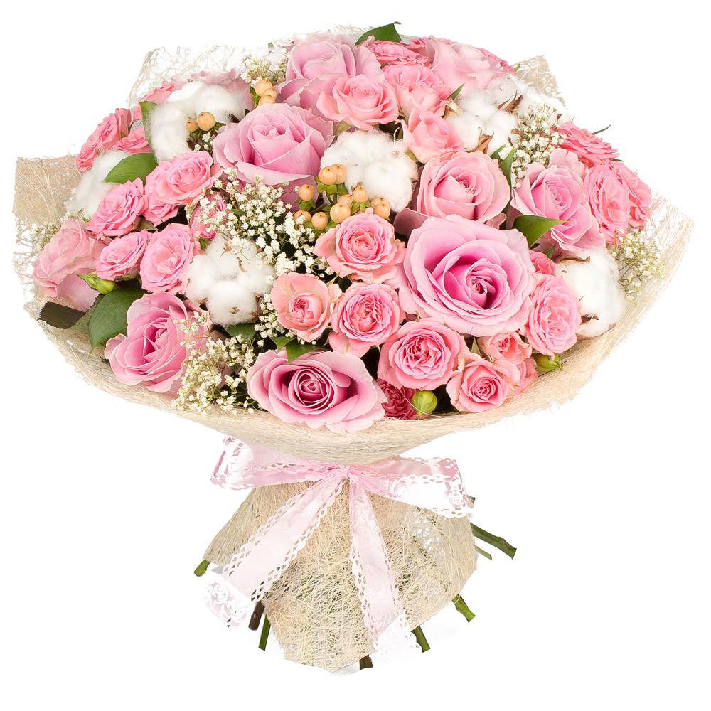 | Состав | Гипсофила, Кустовые розы, Розы, Хлопок |
