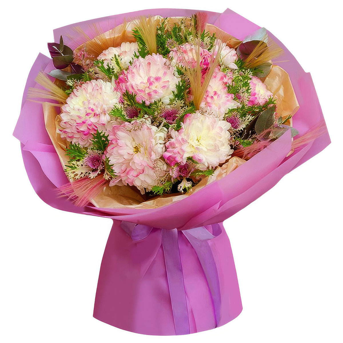 Астра пионовидная дюшес, брассика, сухоцвет, эвкалипт. Упаковка (лента, пленка, крафт, сетка, пленка матовая)