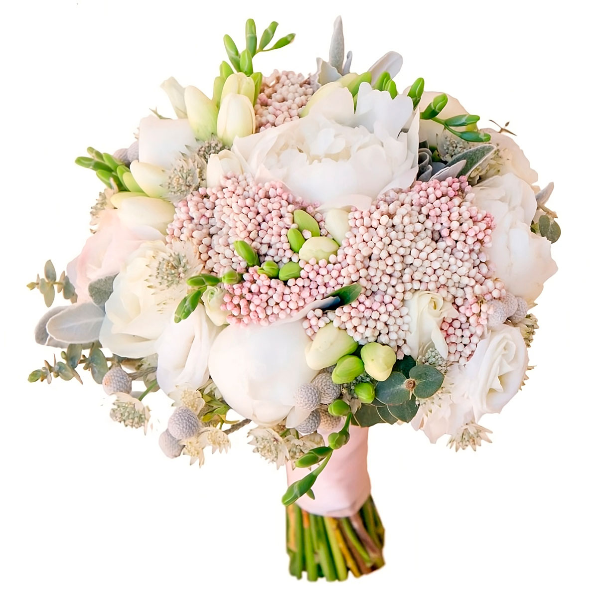Эустома белая, пион белый, роза одноголовая белая, фрезия белая, озотамныс, эвкалипт. Упаковка (лента, пленка, крафт, сетка, пленка матовая)