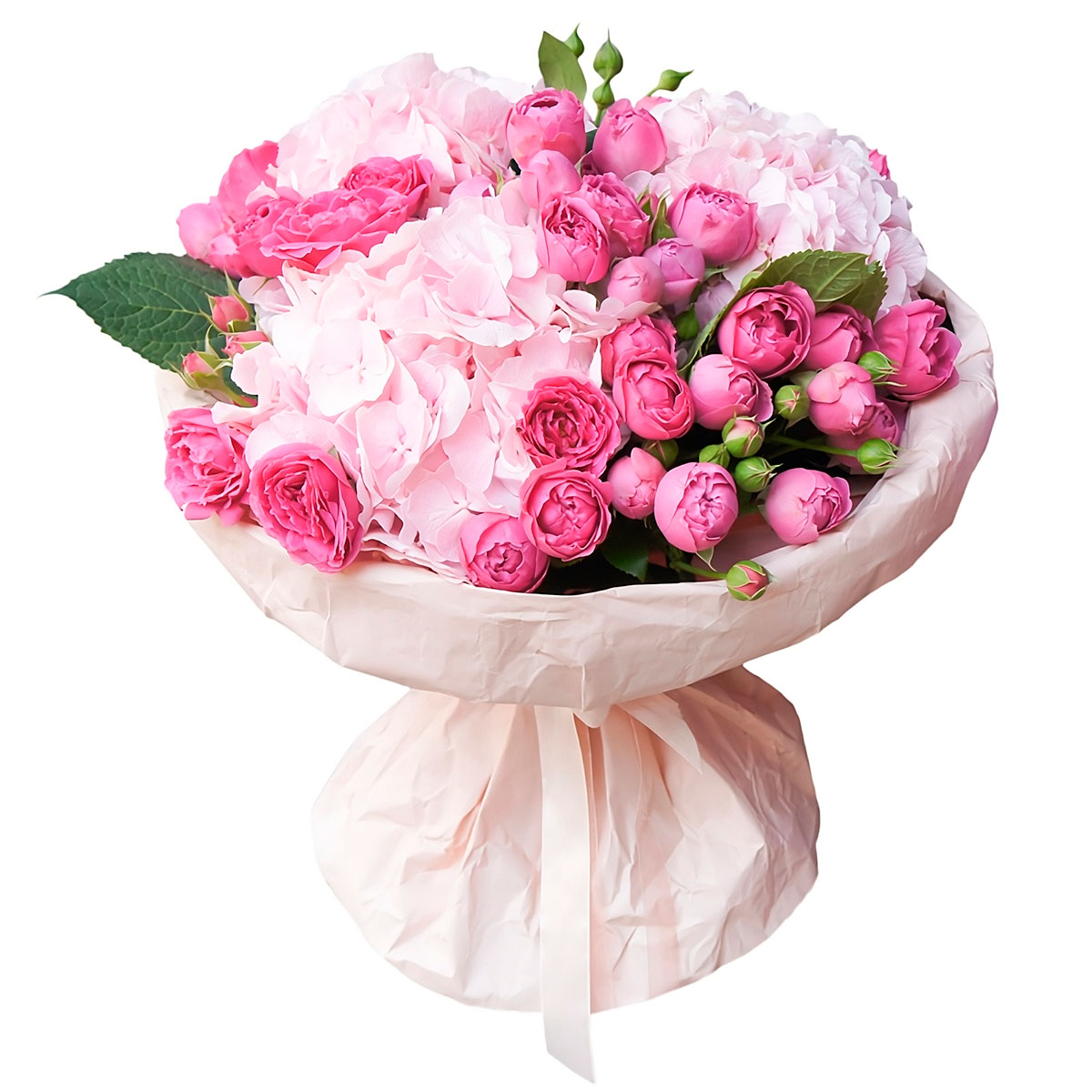 Роза пионовидная розовая, гортензия розовая. Упаковка (лента, пленка, крафт, сетка, пленка матовая)