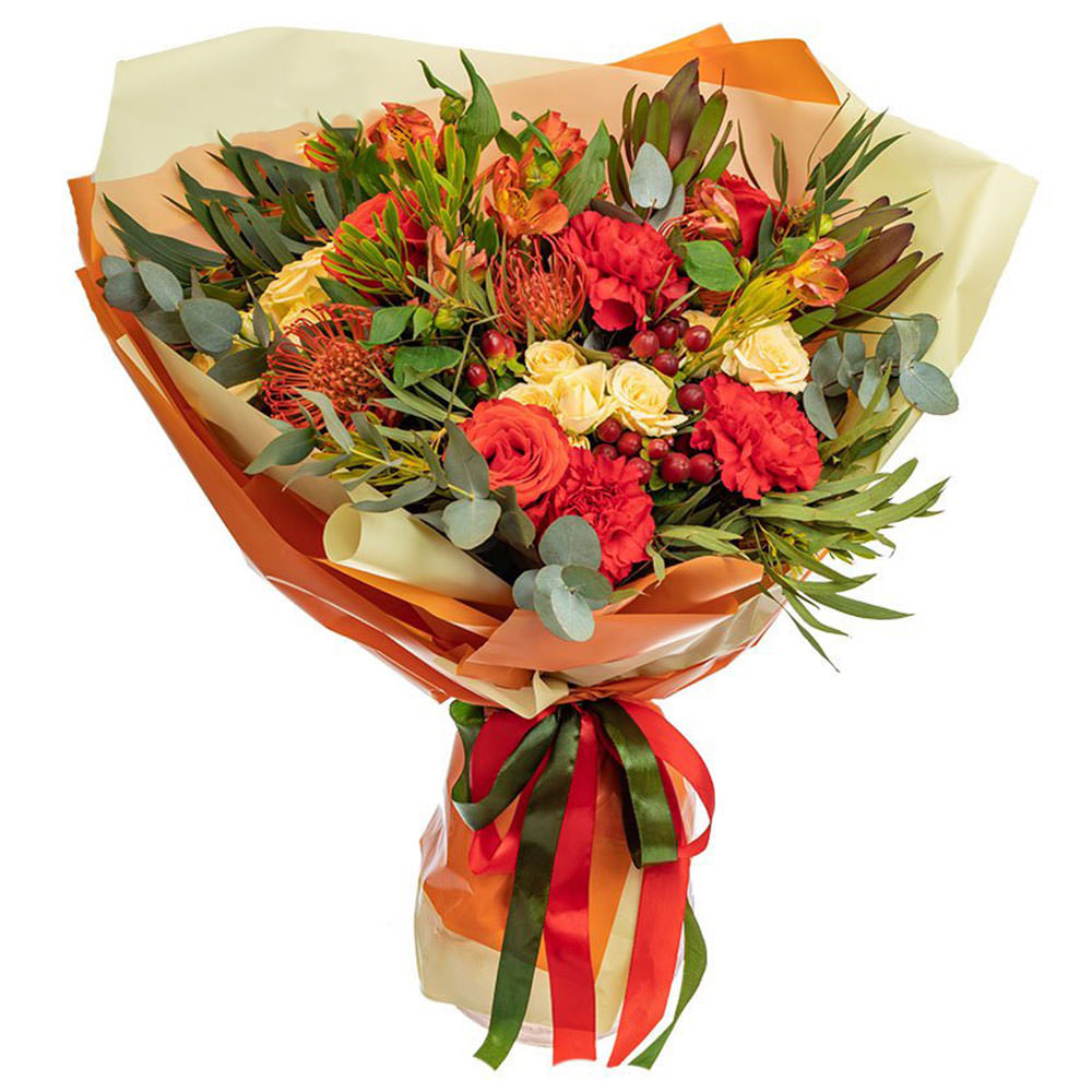 Роза одноголовая красная, роза кустовая кремовая, гвоздика красная, альстромерия оранжевая, фисташка, папоротник, протея, гиперикум, эвкалипт, зелень. Упаковка (лента, пленка, крафт, сетка, пленка матовая)
