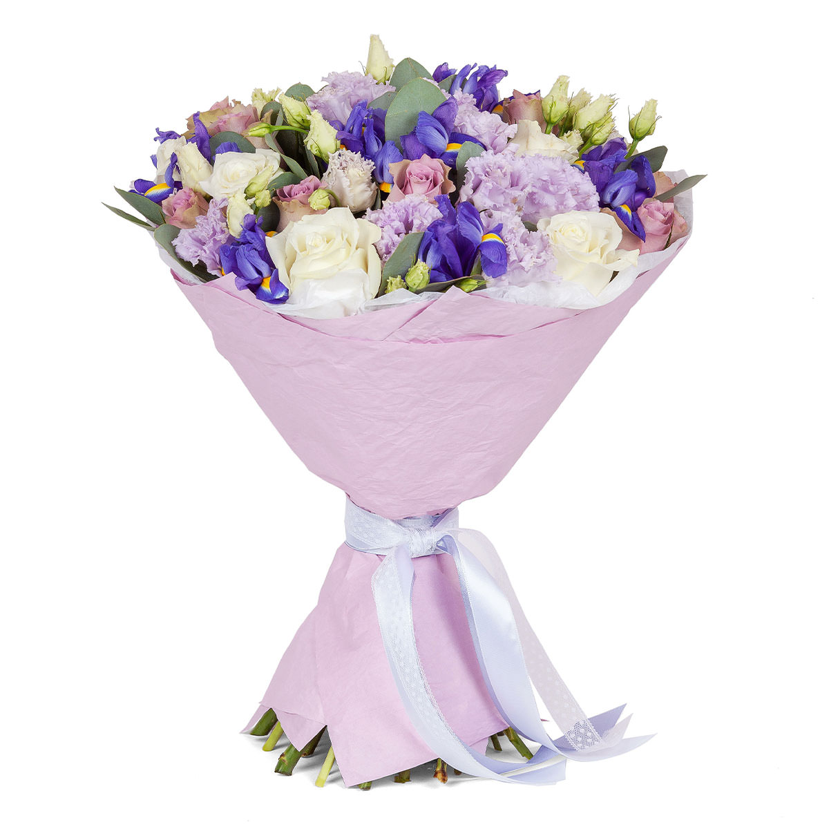 Роза одноголовая белая, роза кустовая сиреневая, эустома сиреневая, ирис фиолетовый, эвкалипт. Упаковка (лента, пленка, крафт, сетка, пленка матовая)