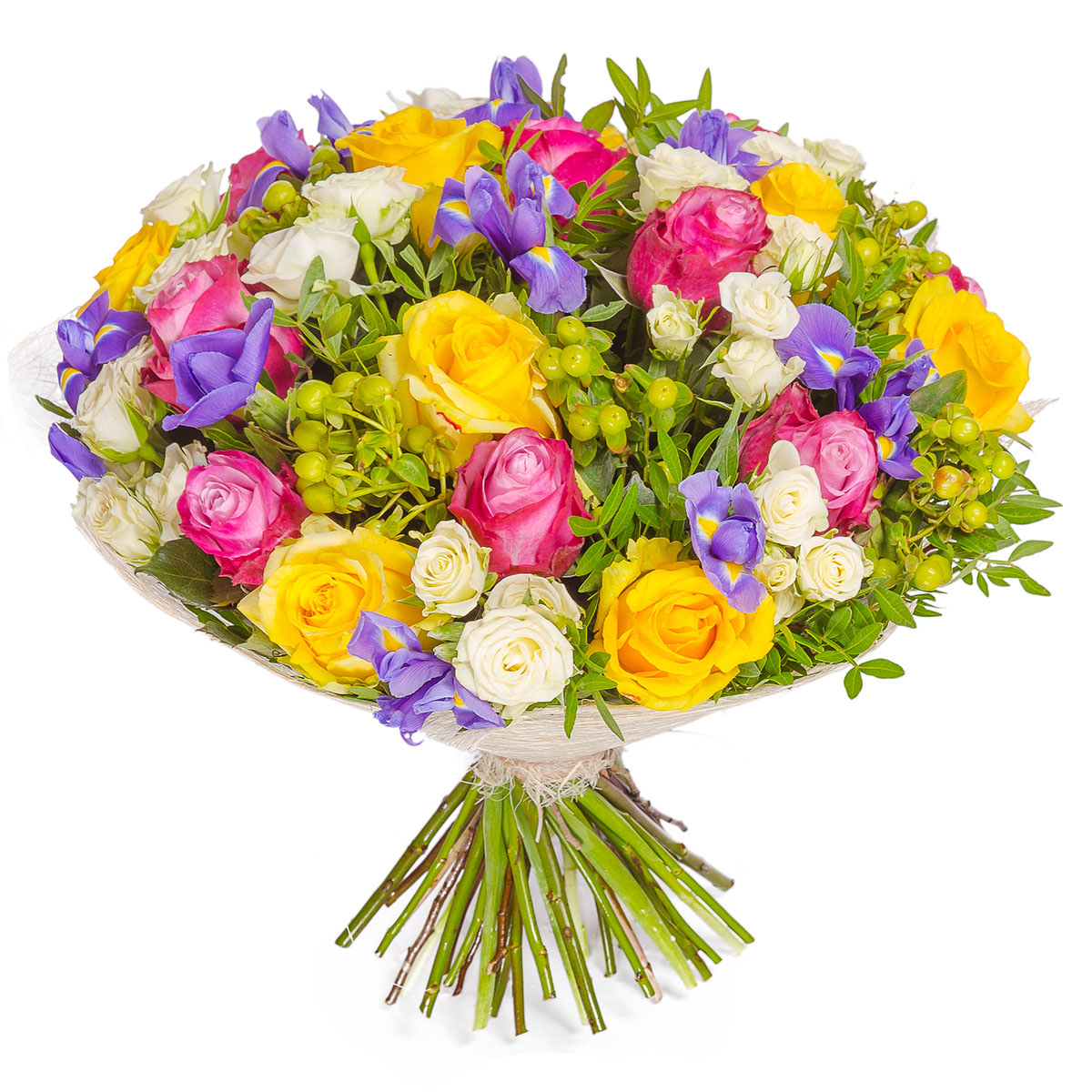 Роза одноголовая желтая и розовая, роза кустовая белая, ирис фиолетовый, зелень. Упаковка (лента, пленка, крафт, сетка, пленка матовая)