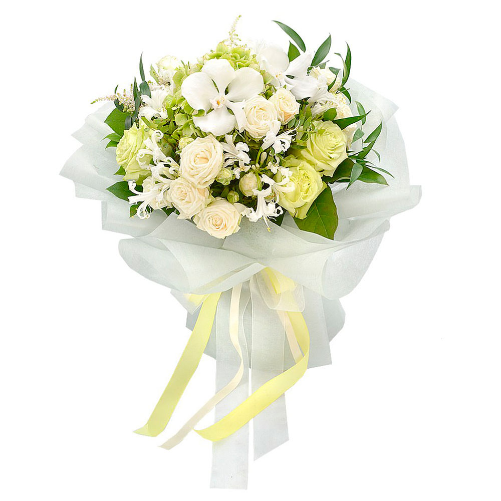Гортензия зеленая, орхидея белая, нерина, роза одноголовая светло-салатовая, роза кустовая белая, салал, астильба, рускус итальянский, фисташка. Упаковка (лента, пленка, крафт, сетка, пленка матовая)