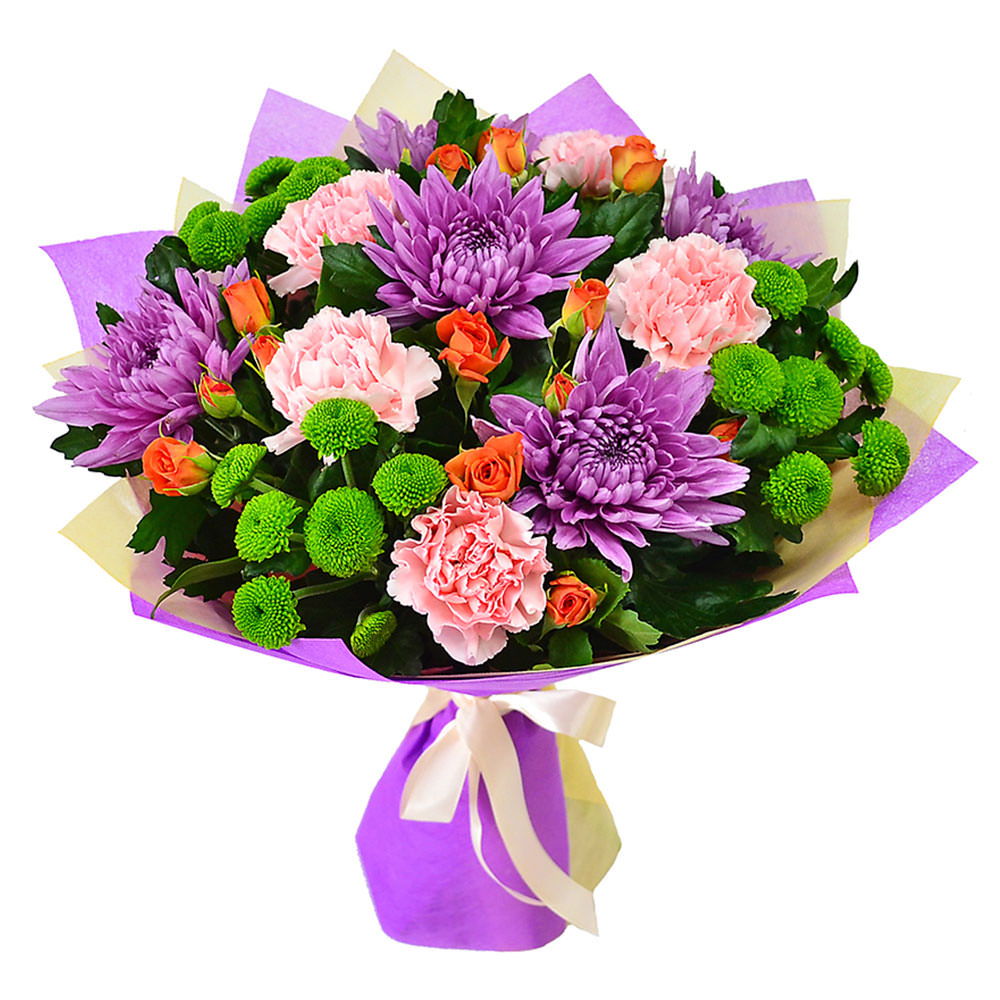 Хризантема одноголовая сиреневая, роза кустовая оранжевая, хризантема кустовая зеленая, гвоздика розовая. Упаковка (лента, пленка, крафт, сетка, пленка матовая)
