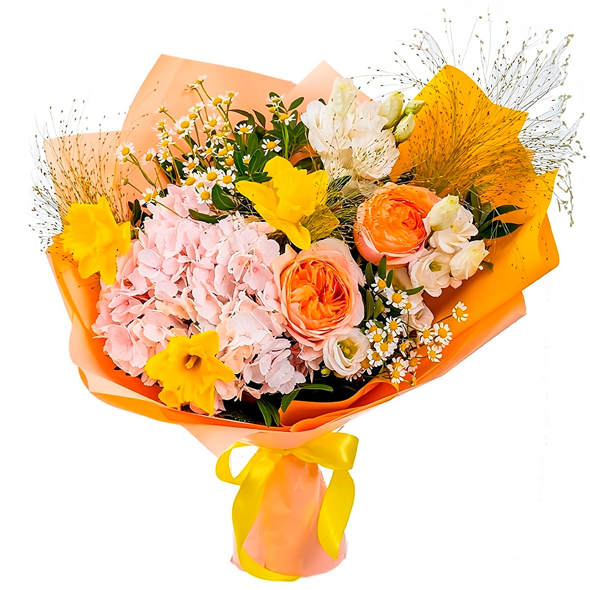 Нарцисс, ромашка кустовая (танацетум), гортензия розовая, роза пионовидная оранжевая, эустома кремовая, зелень. Упаковка (лента, пленка, крафт, сетка, пленка матовая)