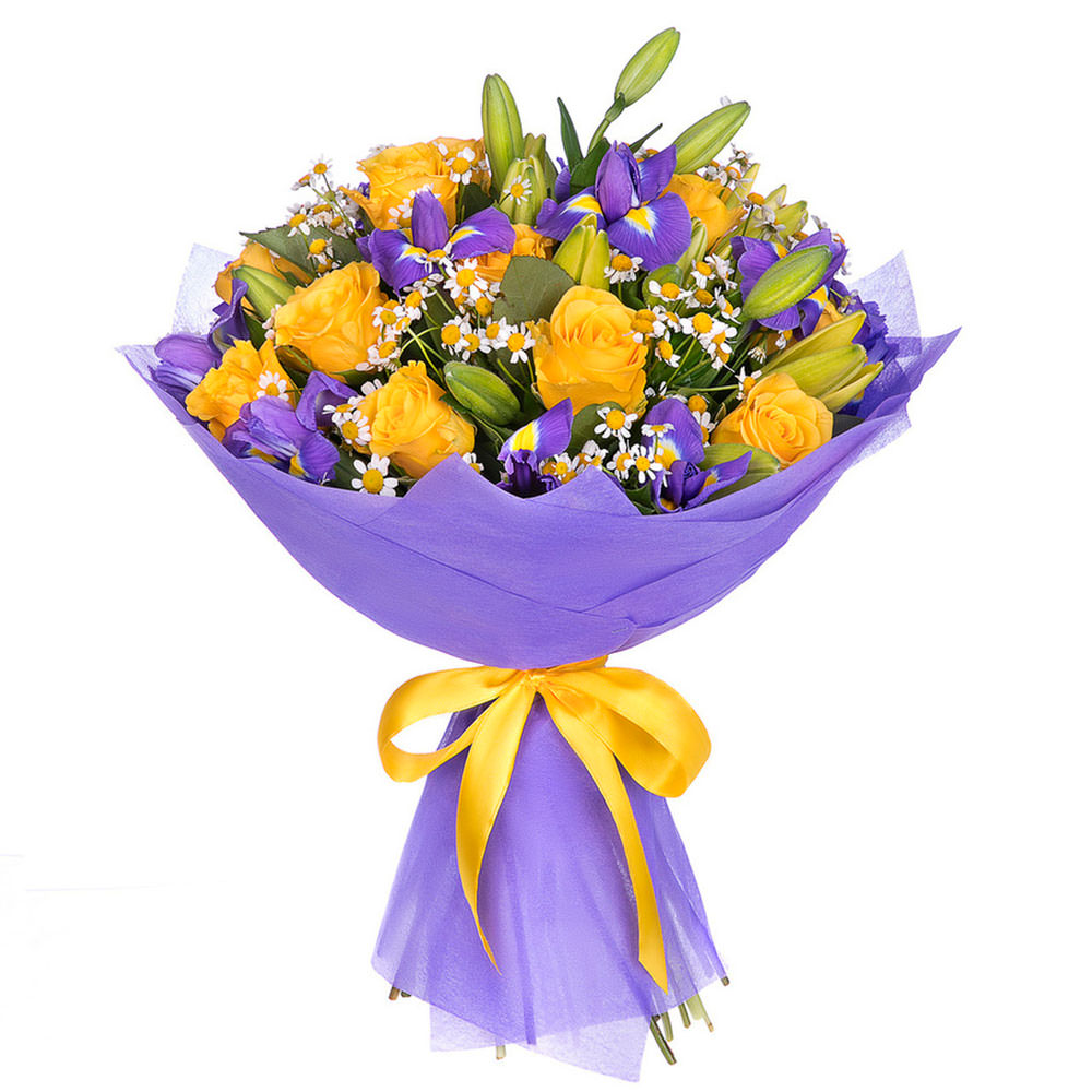 Роза одноголовая желтая, ирис, лилия, хризантема мелкоцветная (ромашка). Упаковка (лента, пленка, крафт, сетка, пленка матовая)