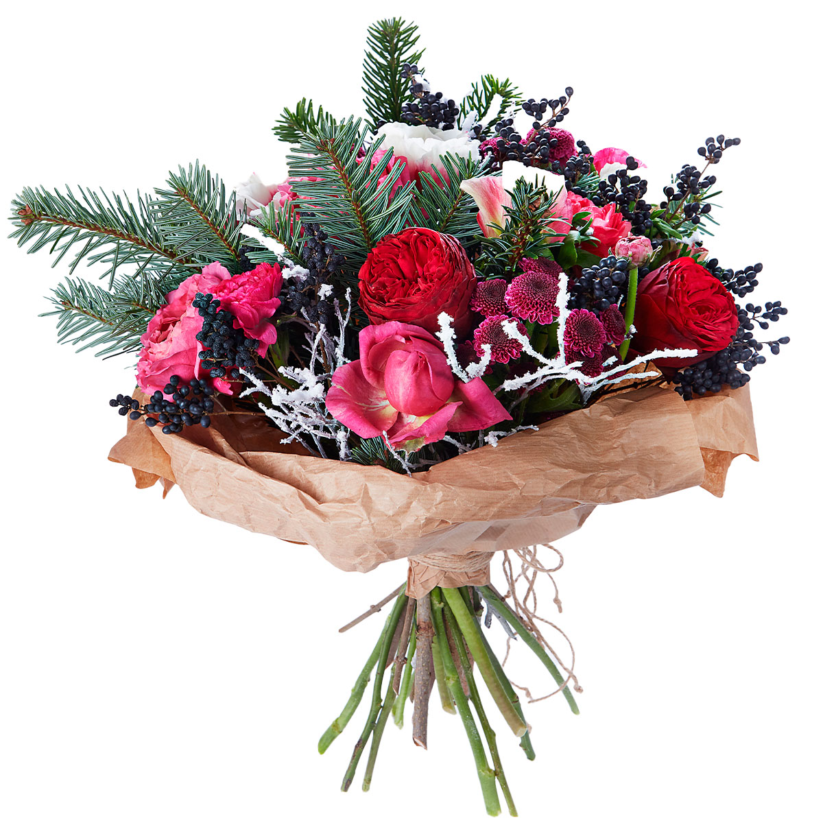 Роза одноголовая пионовидная красная, роза одноголовая розовая, скабиоза, пихта, декоративные ветки. Упаковка (лента, пленка, крафт, сетка, пленка матовая)