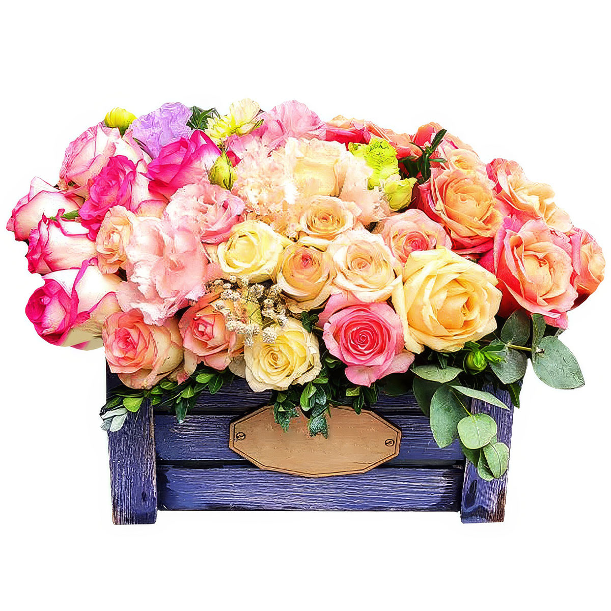 Роза одноголовая разных цветов, эустома розовая, гипсофила, эвкалипт. Упаковка (Корзина, оазис, ящик).