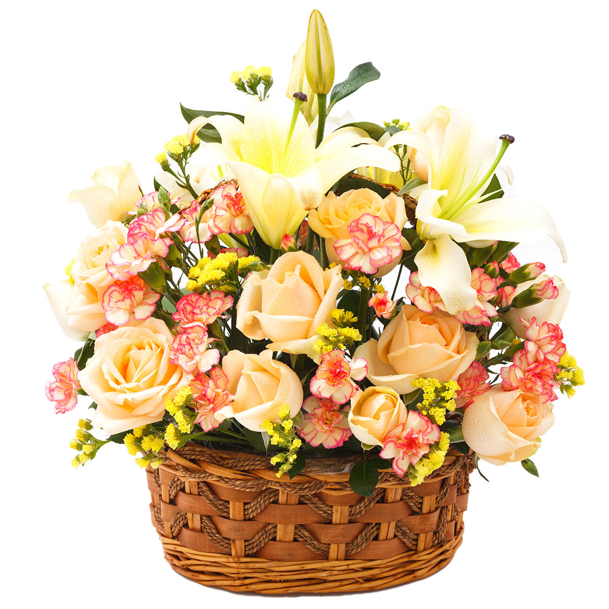 Роза одноголовая кремовая, лилия белая, гвоздика мини розовая, статица желтая. Упаковка (Корзина, оазис, ящик).