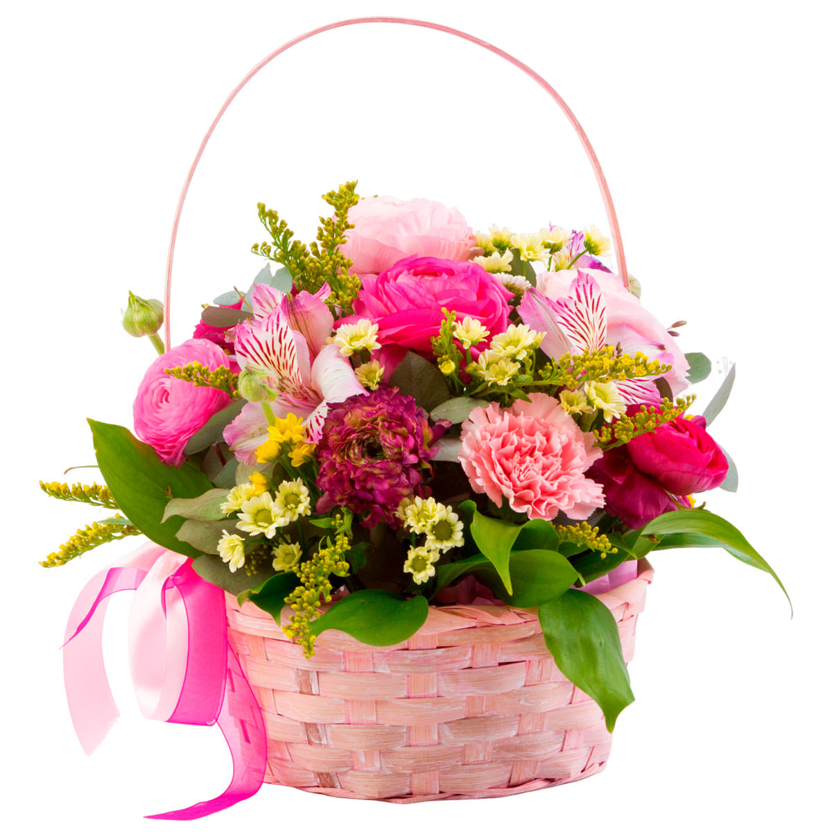 Ранункулюс розовый, гвоздика розовая, альстромерия розовая, солидаго, хризантема сантини Сан ап. Упаковка (Корзина, оазис, ящик).