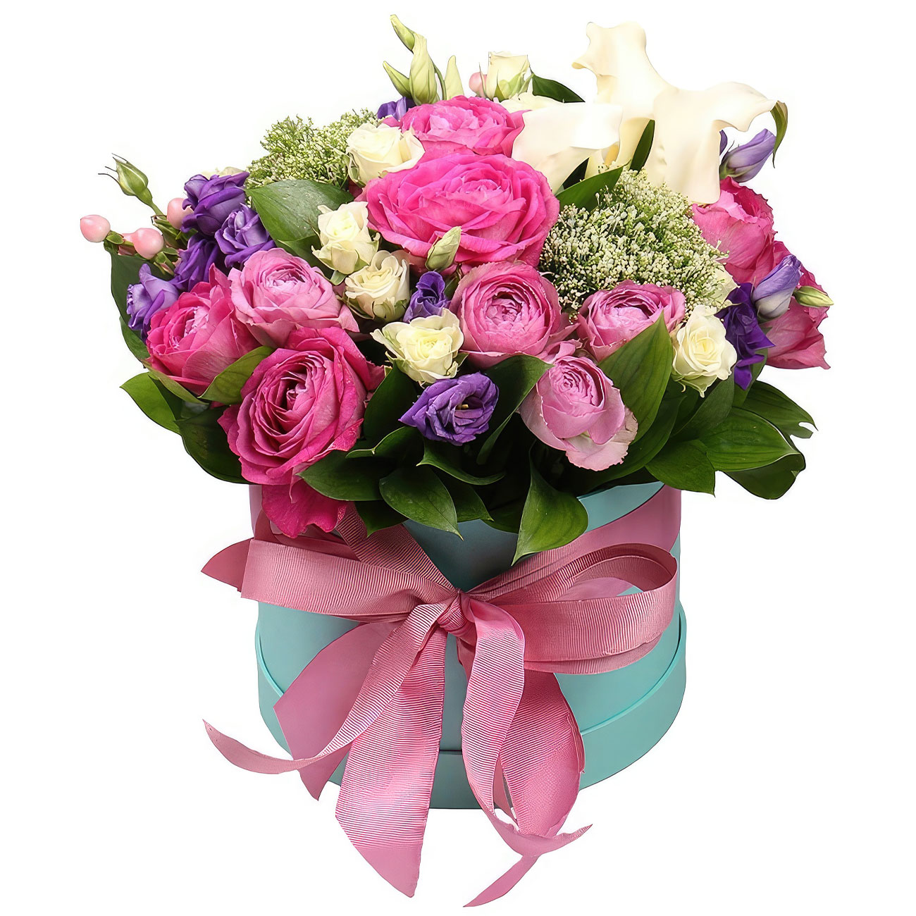 Пионовидная роза розовая, роза кустовая розовая, эустома фиолетовая, гиперикум, зелень. Упаковка (шляпная коробка, квадратный бокс, коробка сердце, оазис)