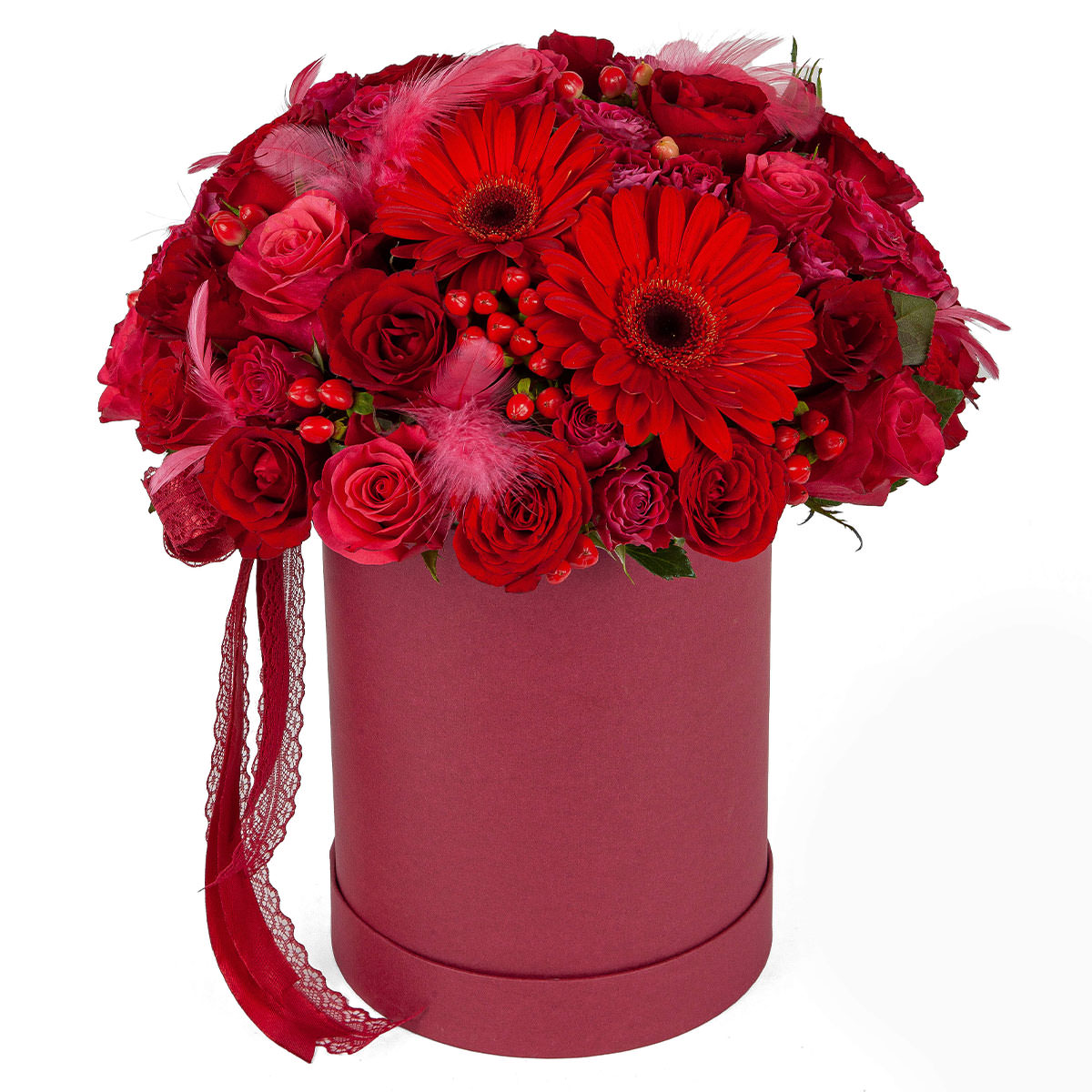 Гербера красная, роза одноголовая красная, роза кустовая красная, гиперикум, перья декоративные, лента. Упаковка (шляпная коробка, квадратный бокс, коробка сердце, оазис)