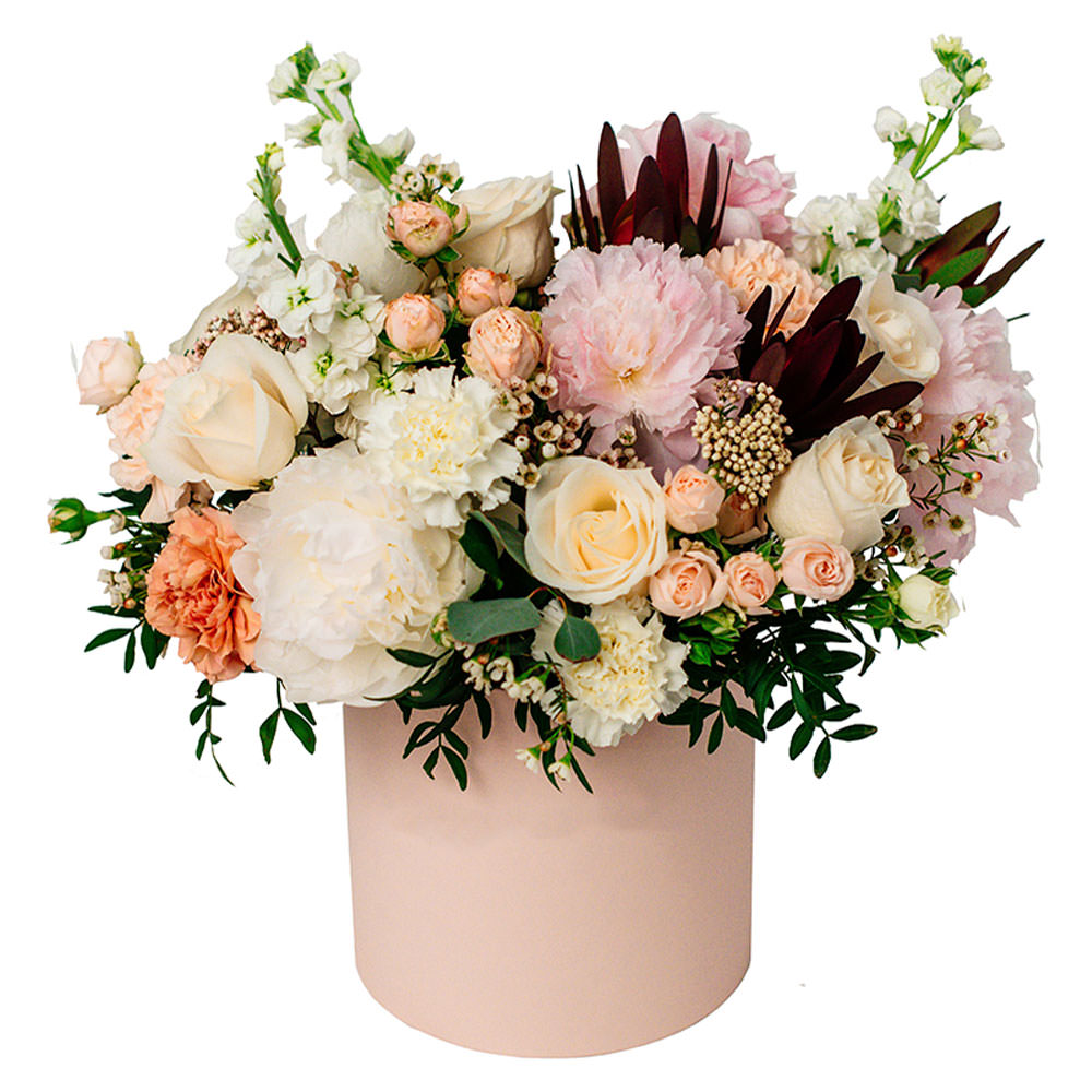 Роза одноголовая кремовая, маттиола белая, хамелациум, кустовая роза кремовая, пион розовый, гвоздика кремовая, леукодендрон, фисташка, эвкалипт. Упаковка (шляпная коробка, квадратный бокс, коробка сердце, оазис)
