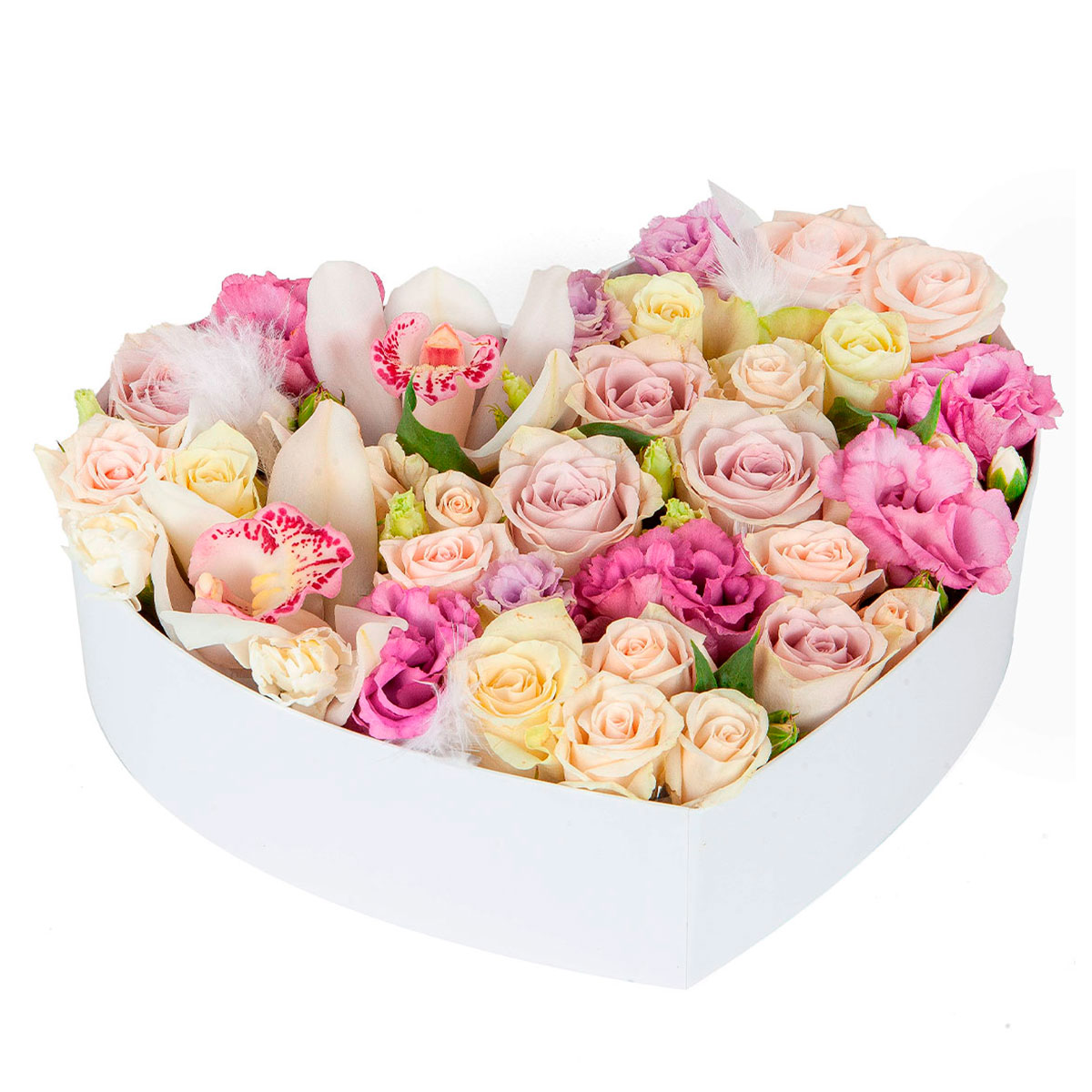 Орхидея белая, роза кустовая розовая, сиреневая и кремовая, эустома лиловая, перья декоративные. Упаковка (шляпная коробка, квадратный бокс, коробка сердце, оазис)